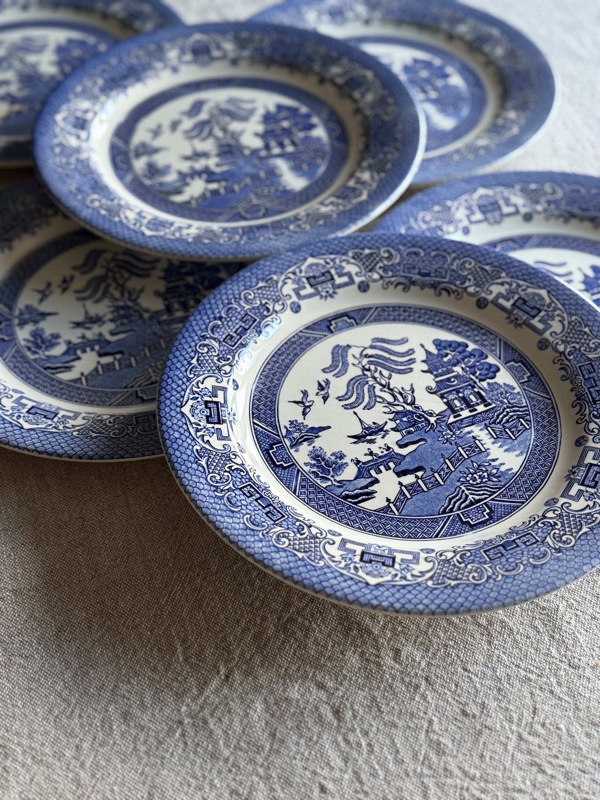 Set of six vintage Blue Willow pattern plates in classic blue and white.
