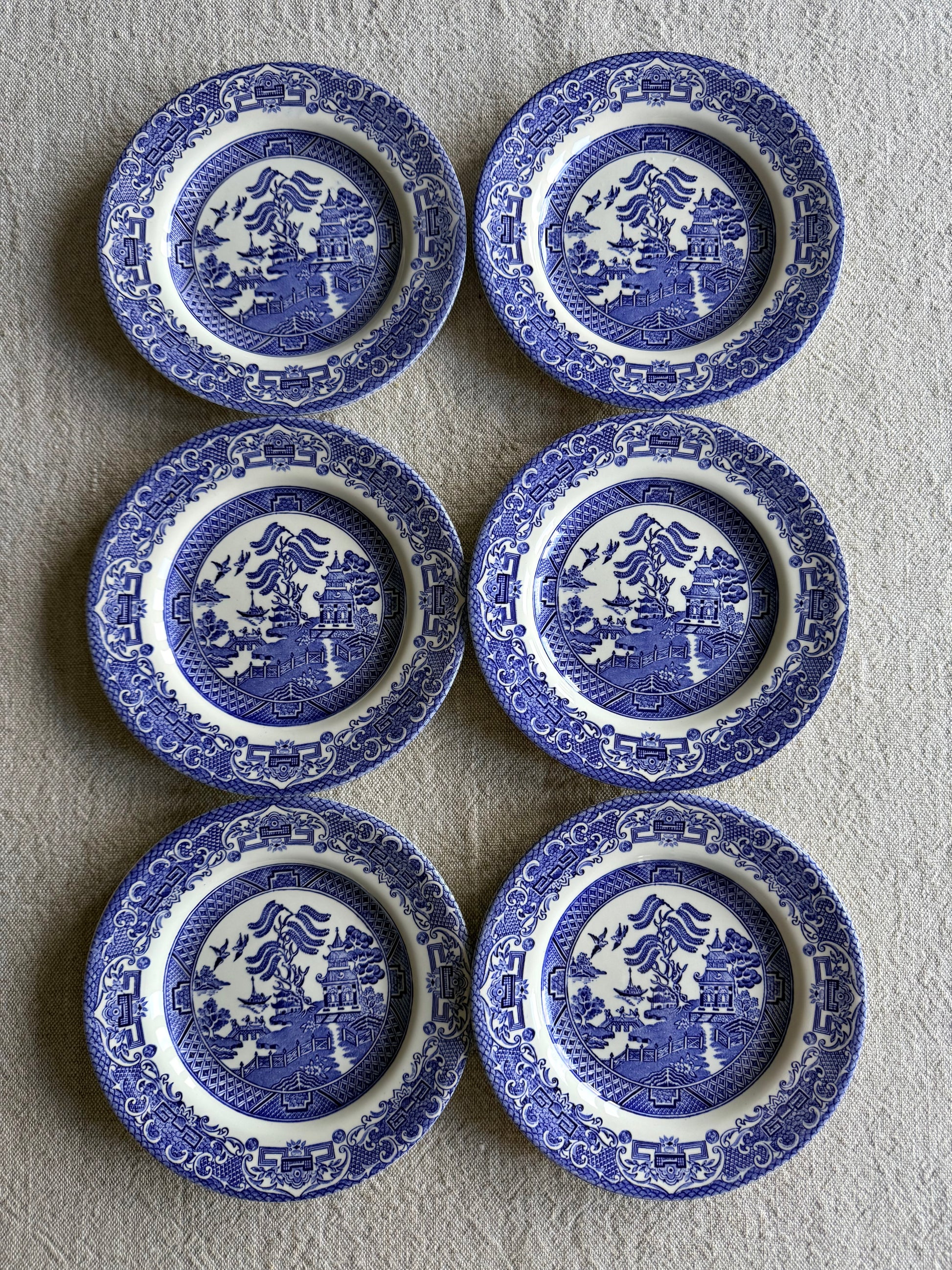 🎀Set of six vintage Blue Willow pattern side plates in classic blue and white.